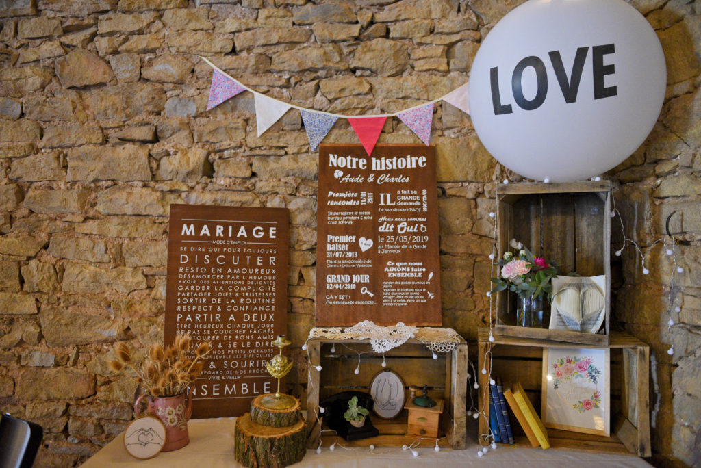 Je vous reparlerais également plus en détail de cela dans mon post sur les animations du mariage. Mais je vous montre déjà le décor de fond de notre photobooth. Il y a beaucoup de travail pour cette espace. En premier lieu deux très grands panneaux que j’adore… Le premier détaille les étapes clefs de notre couple. Le second, moins personnel, pourrait s’intituler « les règles du mariage ».